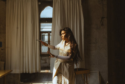 Junié paints primarily in oil and pencil on raw ground. Her work features hand made pigments, archival surfaces, and visible process. Every material is chosen for its permanence and sensitivity.